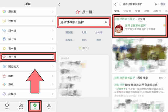 找到“迷你世界家长监护”公众号后关注。同迷找到小程序